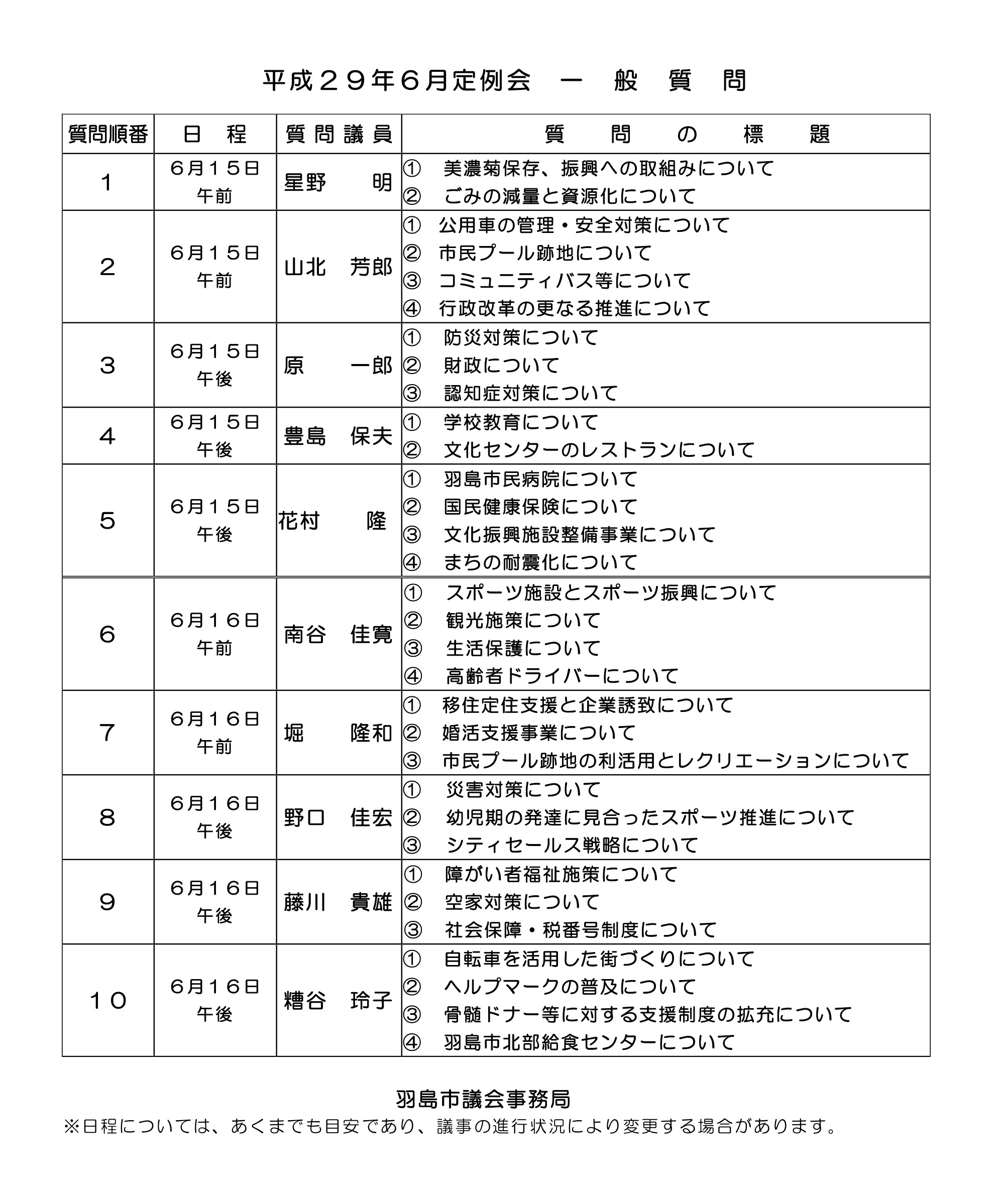 6月定例会が開会となり、一般質問の日程が決定しました。