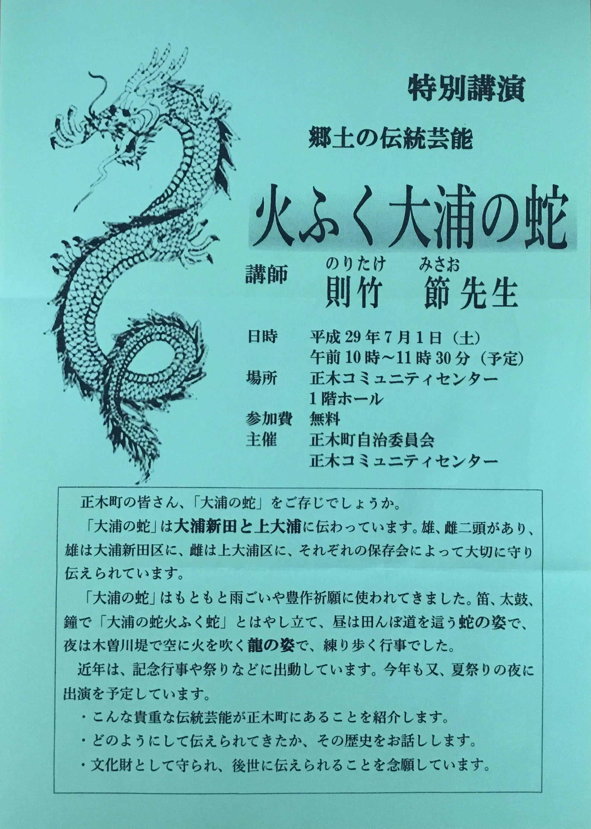 特別講演「郷土の伝統芸能・火ふく大浦の蛇」のご案内