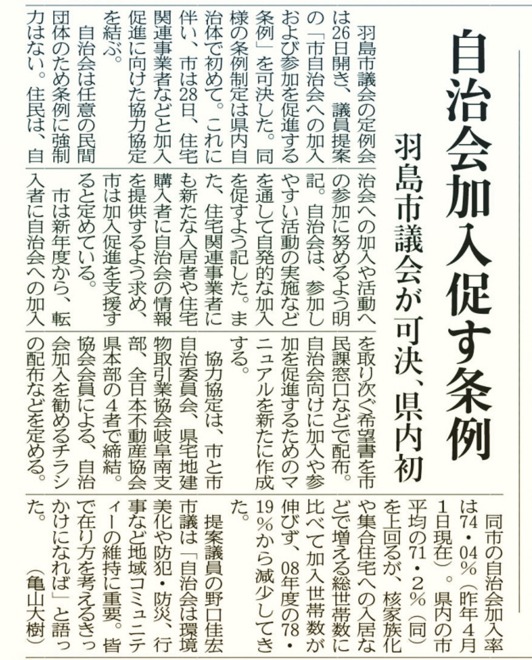 「羽島市自治会への加入及び参加への促進条例」可決~自治会加入促進に関する協定締結へ