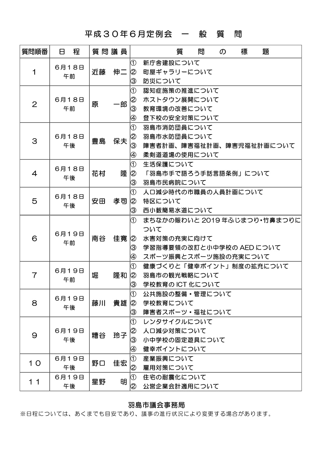 6月定例会 一般質問日程が決まりました!