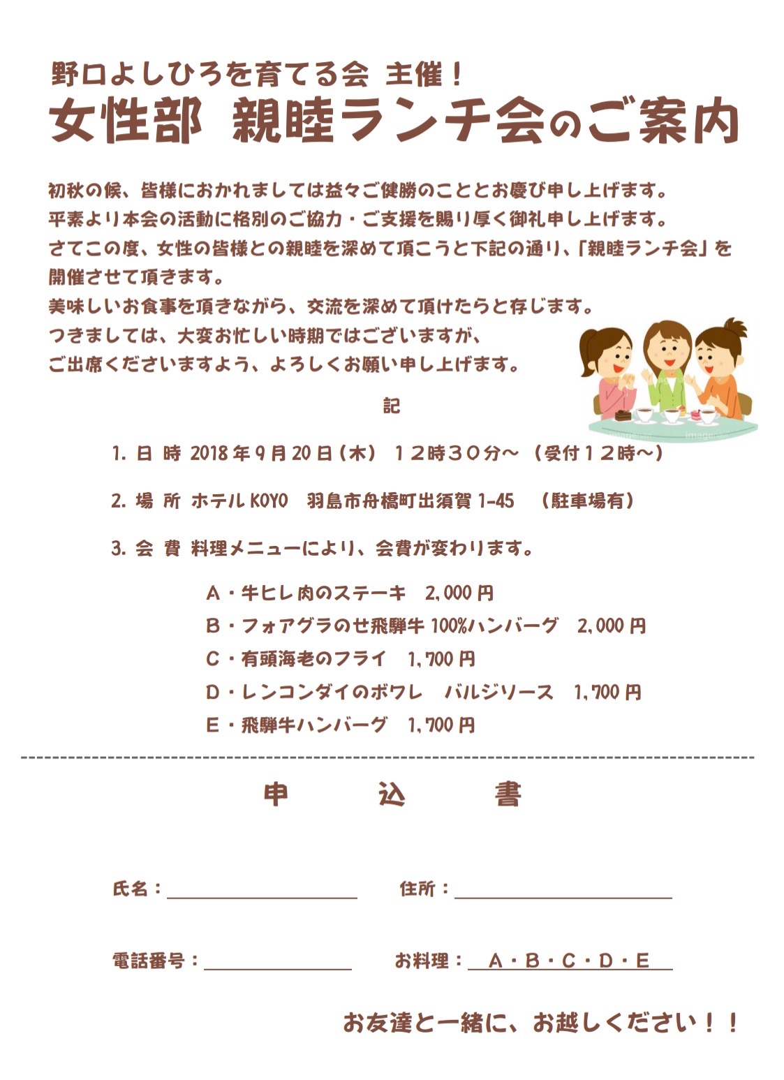 下記の通り、女性部 親睦ランチ会を開催させていただきます。