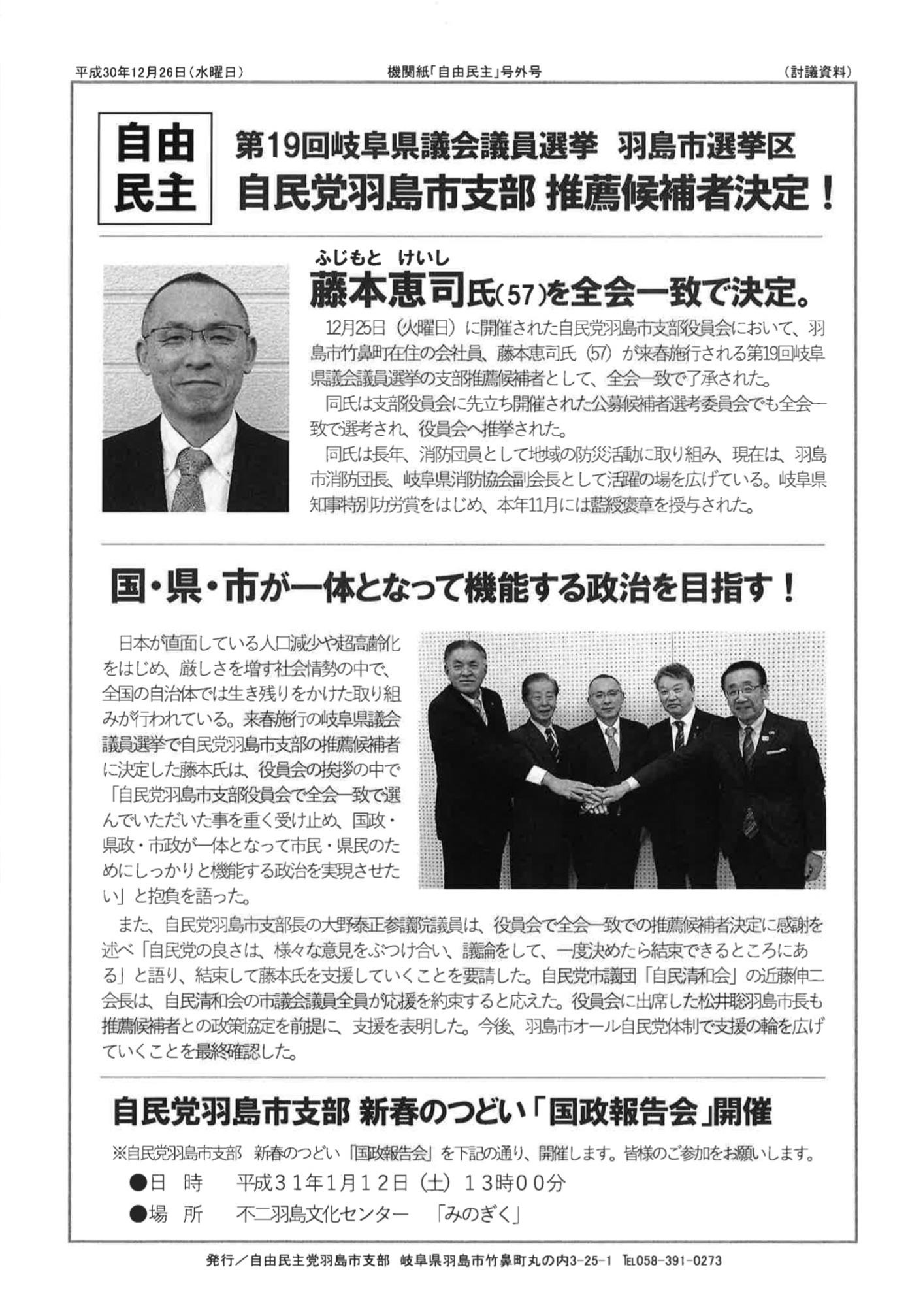 「自由民主 号外」藤本恵司氏を全会一致で推薦候補者に 2018/12/27 岐阜県議会議員選挙羽島市選挙区について、自民党機関紙が発行されたのでお知らせします。 是非、ご覧ください。 Share on FacebookTweetFollow us