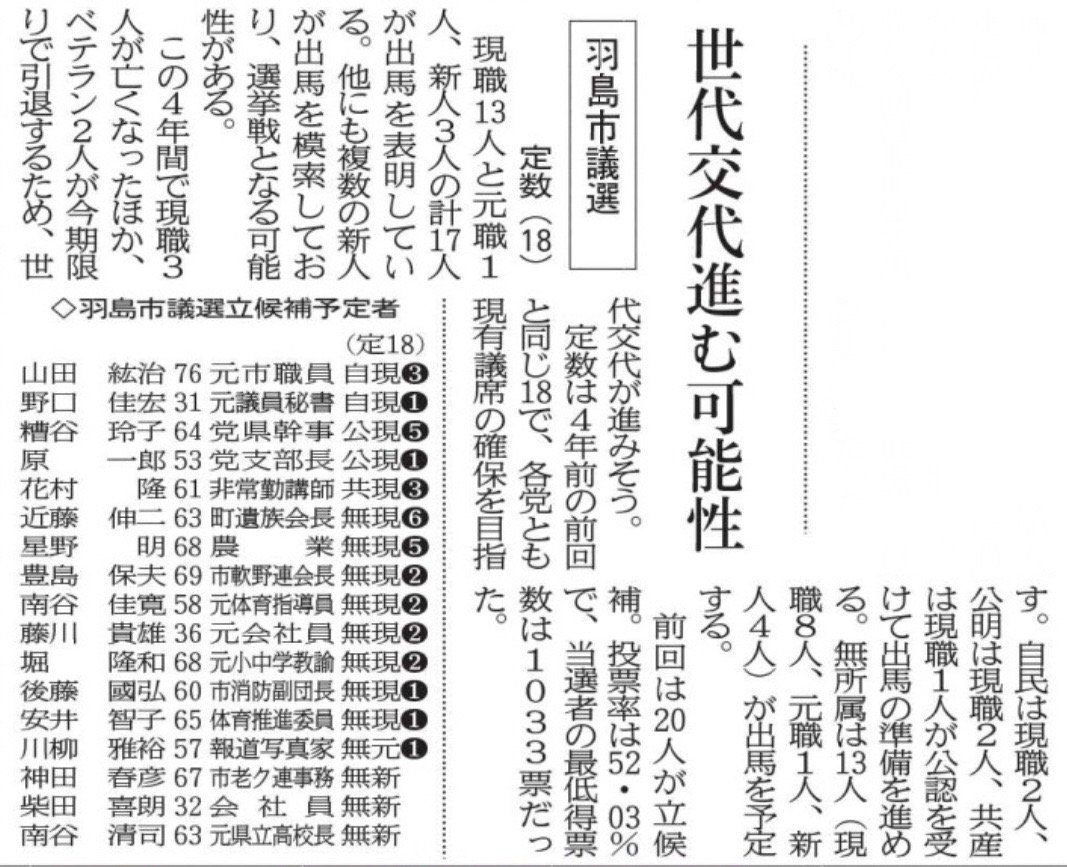 羽島市議選の状況は「3.18付岐阜新聞・朝刊」が報じた通り。