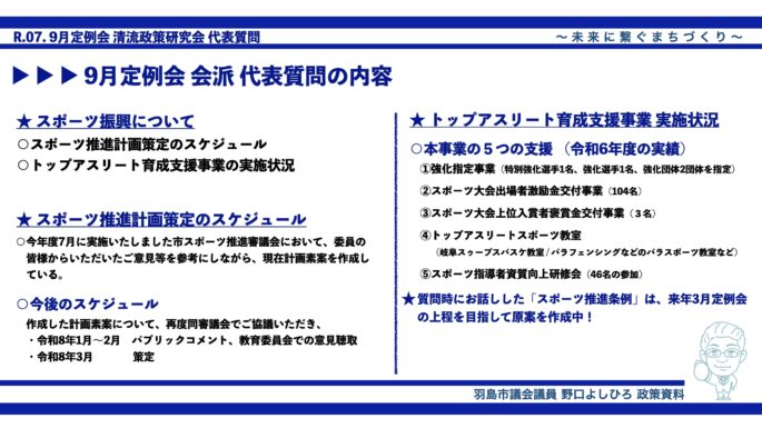 令和7年 9月定例会 会派代表質問 次期スポーツ推進計画&トップアスリート育成支援事業